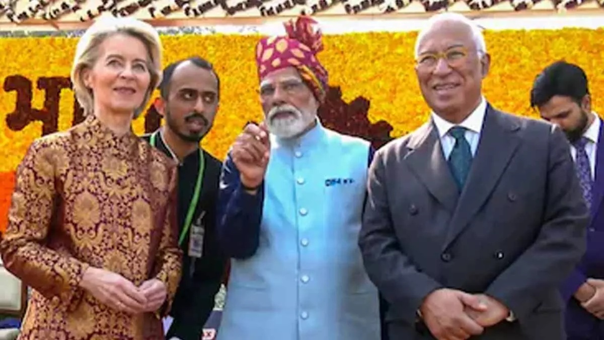 European Commission President Ursula von der Leyen, in a way, made a silent declaration during the 77th Republic Day celebrations on Kartavya Path in New Delhi. Attending the parade as one of the Chief Guests, she chose a Banarasi brocade bandhgala, gracefully blending Indian tradition with a modern, global style.