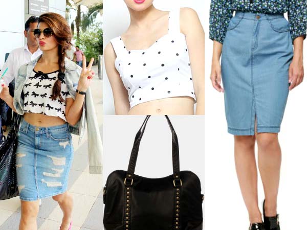 This time Jacqueline Fernandez has swooned our hearts with her travel look and we have decided to cover her outfit. She wore a chic pair of denim skirt and jacket matched neatly with a white crop top. We also admired her black leather bag. Now, do you care to shop this look? Let's get started then...